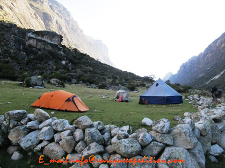 Saliendo del campamento Llamacorral, pasaremos por las lagunas Ichiccocha, Jatuncocha subiendo por un camino en forma zigzagueante estaremos llegando a la Quebrada de Ayhuaycocha y nos dirigiremos hasta el Cb del Nevado Alpamayo en este punto observaremos una laguna de hielo que lleva el nombre de la Quebrada, podremos observar los nevados de Aguja, Santa Cruz, Pumapampa, Curuicachajana, Quitaraju, ALPAMAYO, Pucahirca, Rinrinjirca, Taullipampa, Artesonraju, Paria, Millishraju, estaremos realizando nuestros campamento en este Cb.