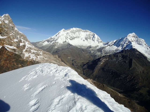 Se pasa el tercer paso de Carnicero (4600). Descenso por en medio de las Lagunas de Atocshaico, Carnicero. Observamos los nevados Siula, Jural, Carnicero y Trapecio.