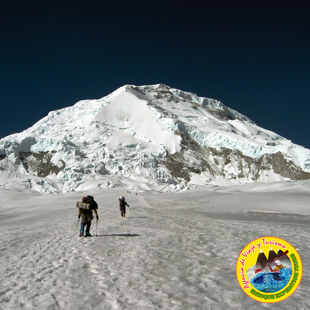 This day, starting from Camp 1, we will descend with our clients to the base of the wall. There we will reach up until the lower part of the Rimaya. In this part we will climbing a zone in great uniform slope of about 55º - 60º and we will reach a steeper part with more than 85° and 90° at a height of 4 meters. Continuing the original channel (65º - 75º), we will meet some small mixed sections until reaching the summit – after, we will return to the Alpamayo base camp.
