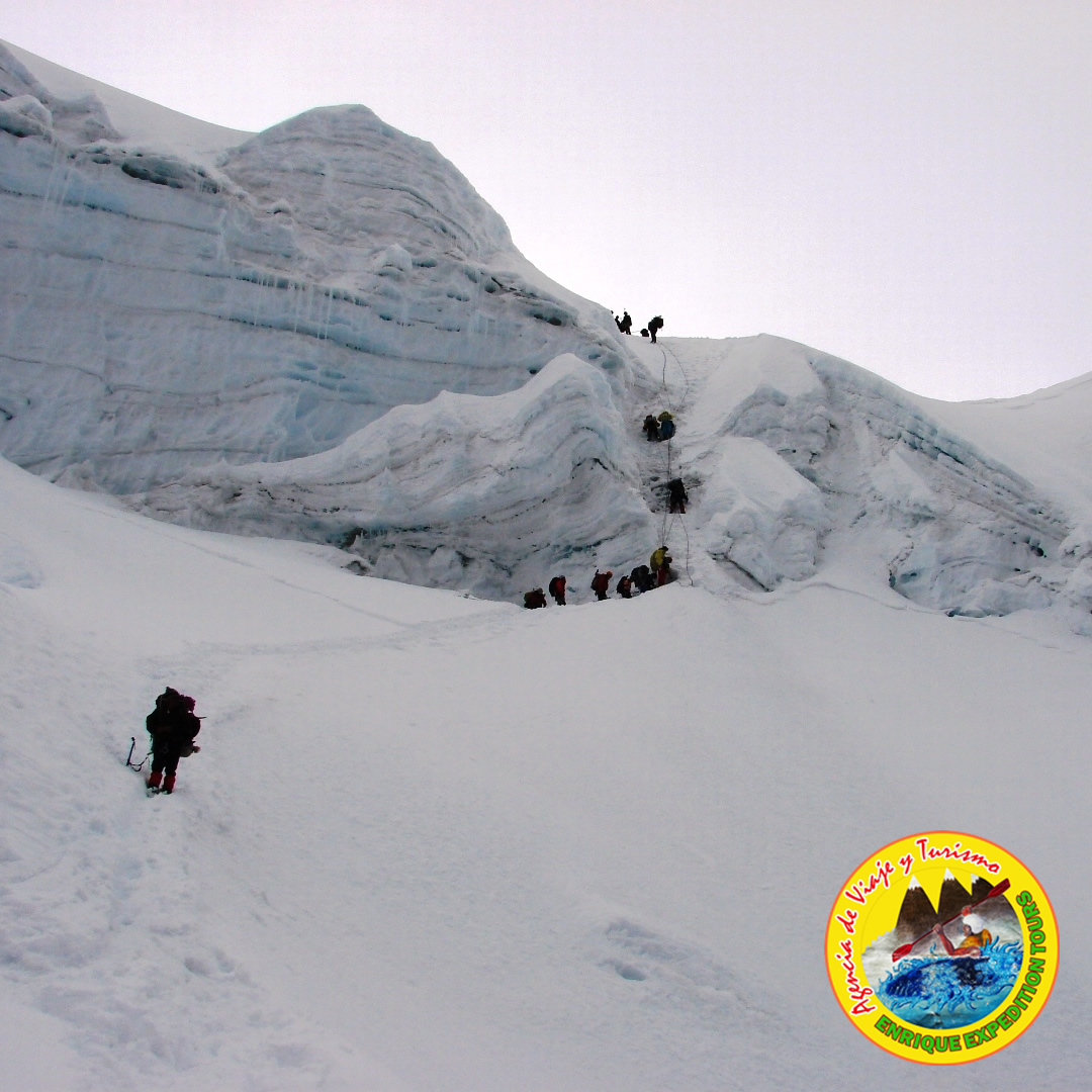Este día desde el Campo 1 descenderemos con nuestros clientes hasta la base de la pared, posteriormente ascendemos hasta alcanzar la parte mas baja de la rimaya, en esta parte se avanza por una zona en gran pendiente uniforme de unos 55º - 60º y lleguemos a una parte mas pendiente de 85º y de 90º en una altura de 4 metros, continuando por la canaleta original (65º - 75º) encontremos algunos pequeños tramos mixtos hasta llegar a la Cumbre cimera – Col.