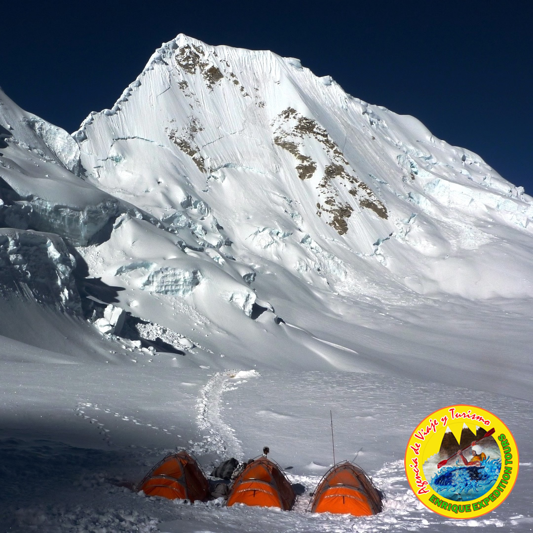 Iniciaremos la ascensión a las 3:00am para estar en la madrugada escalando la pared N, se asciende en 5 horas y se desciende en 3 horas hasta el Campo 1, estaremos saliendo del C1 para descender ligeramente por franco glacial hasta llegar a una loma rocosa que se encuentra al medio de la pared. La ruta asciende a la derecha de una loma rocosa por uniformes pendientes de 45-50º hasta alcanzar la Arista O, que se encuentra a 100m de la cumbre. Después de obtener la cumbre estaremos retornando hasta el campo base, Nuestros porteadores trasportaron todo el equipaje desde el C1 de retorno hasta el Cb Alpamayo (horas aprox. 10 – 12 h). Campamento.