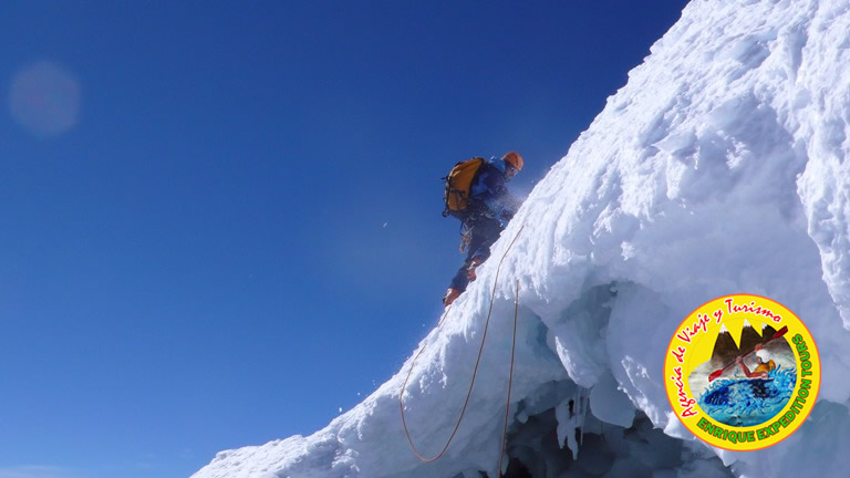 Este día en el trayecto a la cumbre estaremos evitando grietas, hasta el filo de la arista, que es una área plana y fácil desde donde comenzaremos el ascenso a la cumbre, poco antes de la cumbre una grieta interpone. La forma de superar esta grieta es realizando una escalada técnico en hielo en una pared vertical de 90º - 95º y la distancia a escalar es 20 metros, una vez superado este obstáculo estaremos en la cima de Chopicalqui desde donde disfrutaremos de una vista excepcional de la Cordillera Blanca. Retorno al campamento I - Cb.