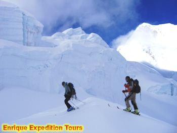 Empezamos la ascensión hacia el campo 1 este día los materiales de Esquí serán trasportado por los portadores y nosotros utilizamos nuestro equipo técnico de escalada y porteando una mochila con equipo básico necesario como son bolsas de dormir, colchonetas, comenzaremos la ascensión, en el trayecto hay tramos de escalada que el guía se encarga de fijar cuerdas para los clientes y dejar todo en buenas condiciones para que no haya ningún tipo de problemas, el tramo no es tan largo hasta llegar al campa 1 donde pernoctará con vistas realmente impresionantes del Alpamayo y Quitaraju.