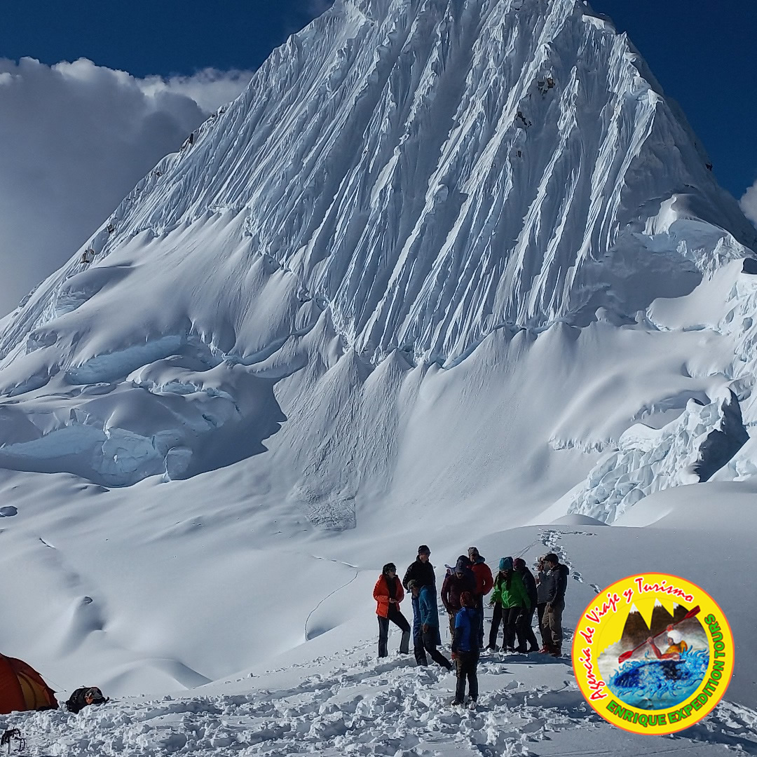 Este día nuestros porteadores se encargaron en trasportar nuestros equipo técnico de escalada, Alimento y campamento y salimos para comenzar a ascender a la morrena, en el trayecto nos encontremos con lugares muy rocoso y estas trochas acompañadas de pulidas rocas granito y tras superarlos lleguemos a ingresar al glacial, ingresemos por la fácil rampas, después de bordear algunas grietas nos situemos debajo de la ya conocida collado, y comenzar a escalar poco a poco hasta llegar a las pendientes finales ( 60º - 65º) y superemos este collado para estar descendiendo unos metros más y ubicarnos en el C1 del Alpamayo. (Campamento 1 - 5300 m.s.n.m).