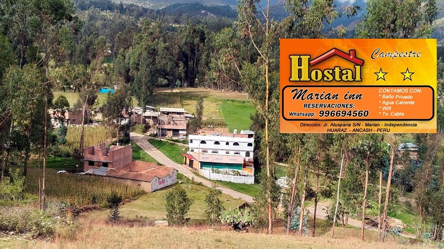 | HOSTAL CAMPESTRE "MARIAN INN" HUARAZ, está ubicado en el Pueblo de MARIAN, a 15 minutos de taxi de la Plaza de Armas de Huaraz, en una zona tranquila y campestre de Huaraz, les ofrecemos habitaciones, equipadas con TV- Cable, WI FI, baño privado con agua caliente las 24 horas, Restaurat - Cafeteria, desayuno regionales, continental o buffet en caso de grupos (a solicitud ), Almuerzos y Cenas con comida Típico de Huaraz; servicios complementarios como: servicio de traslado gratuito del terminal de bus en Huaraz al hostal, custodia de equipajes, cafeteria restaurante, lavandería, cambio de moneda, También contamos con un local adicional donde Ud. puede realizar cualquier evento social (Reuniones de trabajo, cumpleaños, rencuentros, etc.) esto siempre acompañado y en contacto directo con la naturaleza; a todo esto resaltando nuestro servicio profesional y personalizado hacia todos nuestros huéspedes y clientes. |