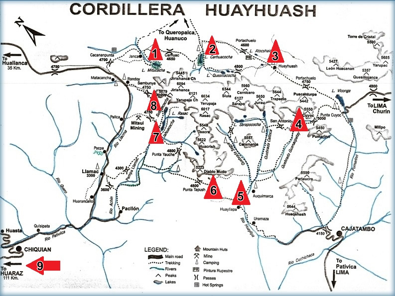 MAPA DE LA RUTA DE TREK CORDILLERA HUAYHUASH PASO TRAPECIO 11 DIAS.